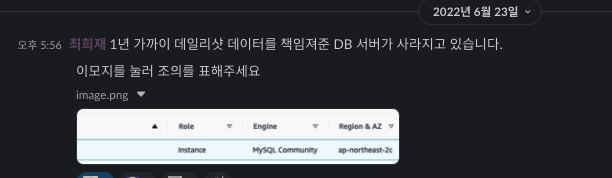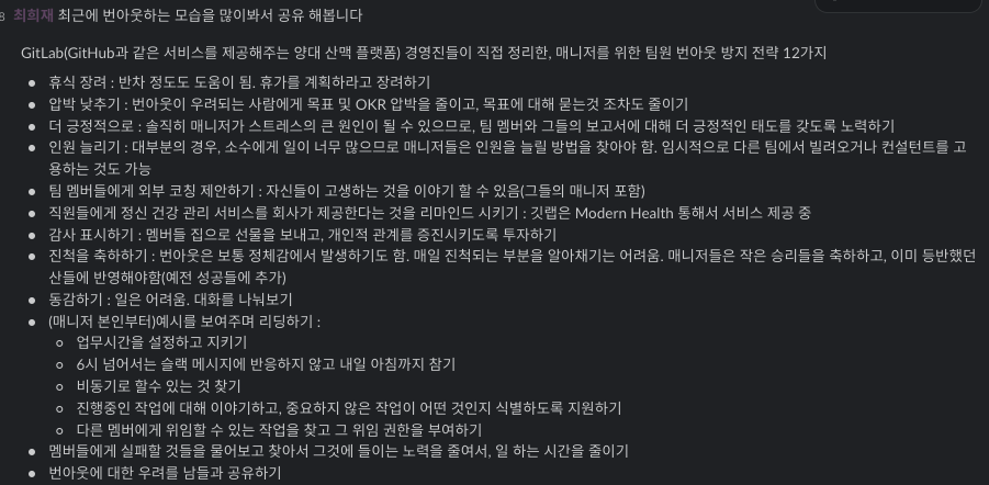- 이때 당시 팀원들은 내가 공유 하는 자료들에 리액션이 별로 없었던 것 같다. 지금 보니 좀 쓸쓸해 보이는 공유 메시지가 많은데 지금 팀원들이 공유 해주면 잘 리액션 해줘야겠다.